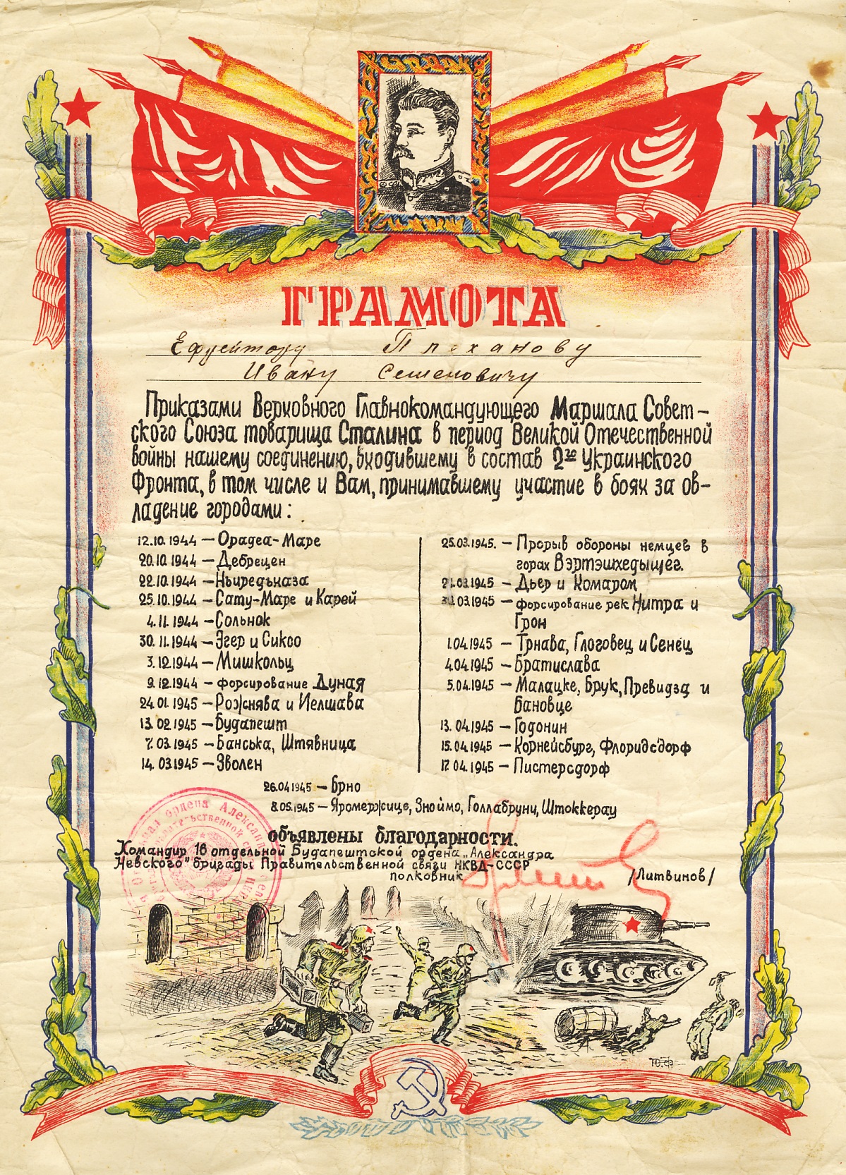 Родился в 1906 г. в с. Сосновый Солонец Ставропольского района Куйбышевской области в крестьянской семье. В 1915 г. закончил 2 класса Сосново-Солонецкой начальной школы, работал в колхозе им. Куйбышева. 15 сентября 1928 г. был призван Куйбышевским РВК на срочную службу в ряды РККА. Вернувшись, женился, родились дети. 25 июня 1941 г. вновь мобилизован Молотовским (ныне Ставропольским) РВК Куйбышевской области на Великую Отечественную войну. Воевал на Ленинградском фронте в 409-й отдельной строительной роте связи телефонистом в звании рядовой. Участвовал в боях за оборону Ленинграда. 5 февраля 1942 г. получил контузию, ранение в левое плечо в г. Ленинграде. С мая 1943 по январь 1946 гг. Иван Семёнович воевал на 2-м Украинском фронте в 16-м отдельном ордена Александра Невского полку правительственной связи НКВД СССР 461-м отдельном батальоне 926-й строительной эксплуатационной роте связи телефонистом, старшим линнадсмотрщиком в звании ефрейтор. 14 февраля 1945 г. был представлен командиром 461-го отдельного батальона капитаном Саркисовым к награде – ордену Красной Звезды. В наградном листе значится: «При выполнении боевых заданий проявлял исключительную находчивость и инициативу. Во время разрушений цепей правительственной связи от огня противника, проходящих на переправе реки Дунай, в момент налета авиации не уходил с линии до полного восстановления связи, действуя решительно и смело. Своим личным примером товарищ Плеханов воодушевлял остальных бойцов на презрение к смерти для выполнения боевой задачи, тем самым давал возможность обеспечивать связью со-единения Красной Армии со штабом фронта. Ефрейтор Плеханов достоин награды орденом Красной Звезды». Но начальник ОПС НКВД 2-го Украинского фронта полковник Литвинов в заключительной резолюции представил к медали «За отвагу». Кроме медалей, Иван Семёнович поощрен благодарностью от Верховного Главнокомандующего за овладение городом Нарва, грамотой за боевые действия на территории европейских государств. С января 1946 г. Иван Семёнович служил телефонистом в городе Кировабаде в 48-м пограничном отряде частей НКВД СССР. Полностью демобилизовался 10 мая 1947 г., вернулся в родное село, работал в колхозе до выхода на пенсию. Умер 23 февраля 1993 г. Похоронен на кладбище в с. Сосновый Солонец.