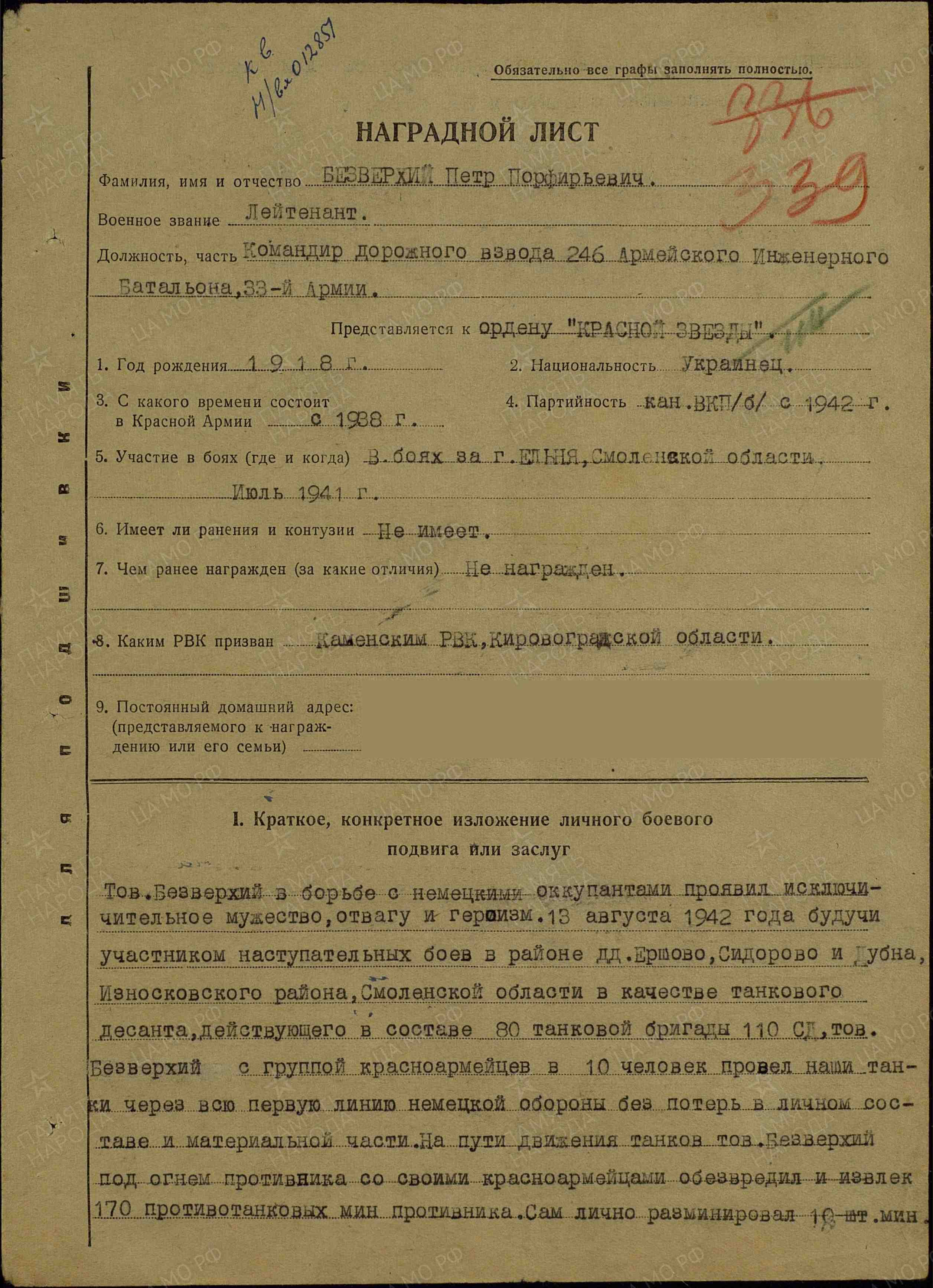 Тов. Безверхий в борьбе с немецкими оккупантами проявил исключительное мужество, отвагу и героизм. 13 августа 1942 года, будучи участником наступательных боев в районе деревень Ершово, Сидорово и Дубна Износковского района Смоленской области в качестве танкового десанта, действующего в составе 80-й танковой бригады 110-й стрелковой дивизии, тов. Безверхий с группой красноармейцев из 10 человек провел наши танки через всю первую линию немецкой обороны без потерь в личном составе и материальной части. На пути движения танков тов. Безверхий под огнем противника со своими красноармейцами обезвредил и извлек 170 противотанковых мин противника. Сам лично разминировал 12 штук мин. Задание танкового десанта под руководством лейтенанта Безверхого выполнено отлично и без потерь. Достоин правительственной награды - ордена Красной Звезды (наградной лист от 17.09.1942 г.).